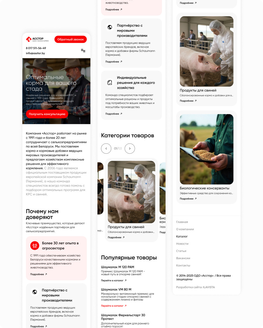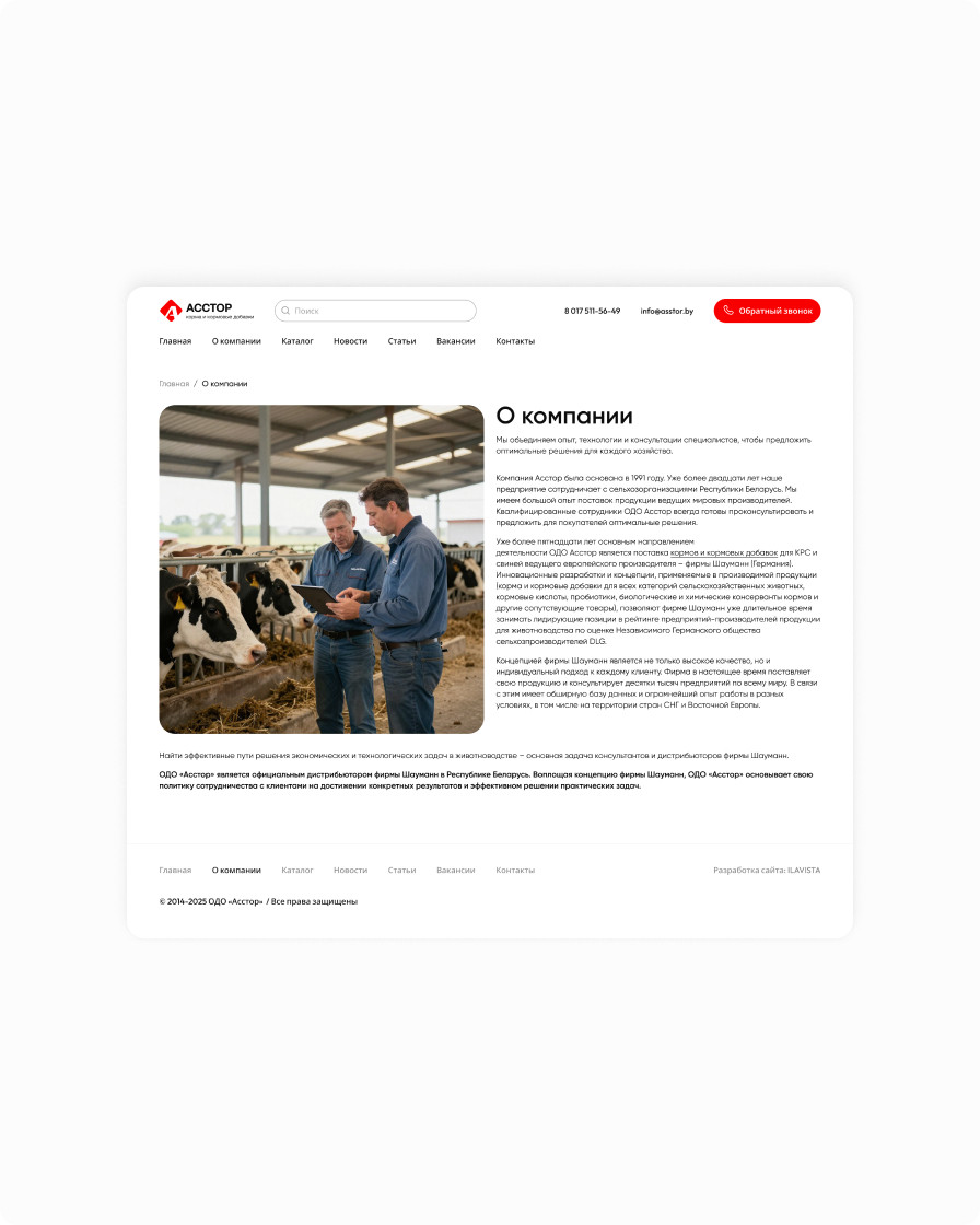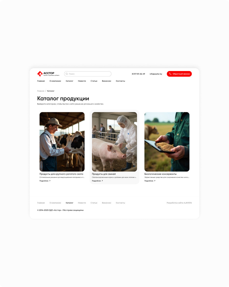 Asstor is a supplier of feed and feed additives for cattle and pigs. The new corporate website reflects the brand’s expertise, while the catalog enables quick and convenient search for the right products. Thanks to an easy‑to‑use admin panel, company staff can manage the content themselves: edit texts, add and remove products, news, and articles. Contact ILAVISTA to build a similar custom solution for your business.