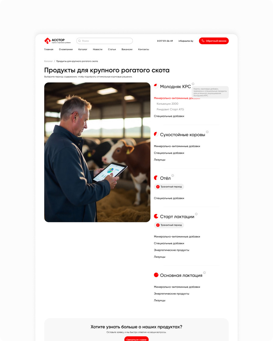 Corporate website for Asstor, a company supplying feed and feed additives for cattle and pigs, featuring a refreshed interface and a convenient product catalog.