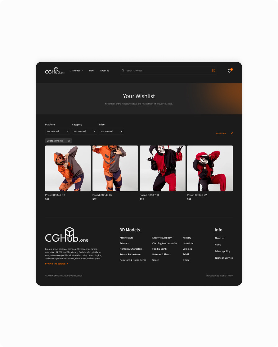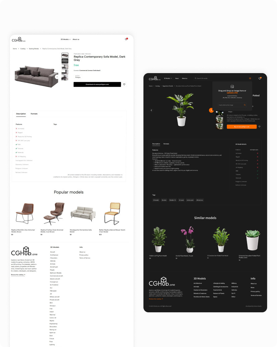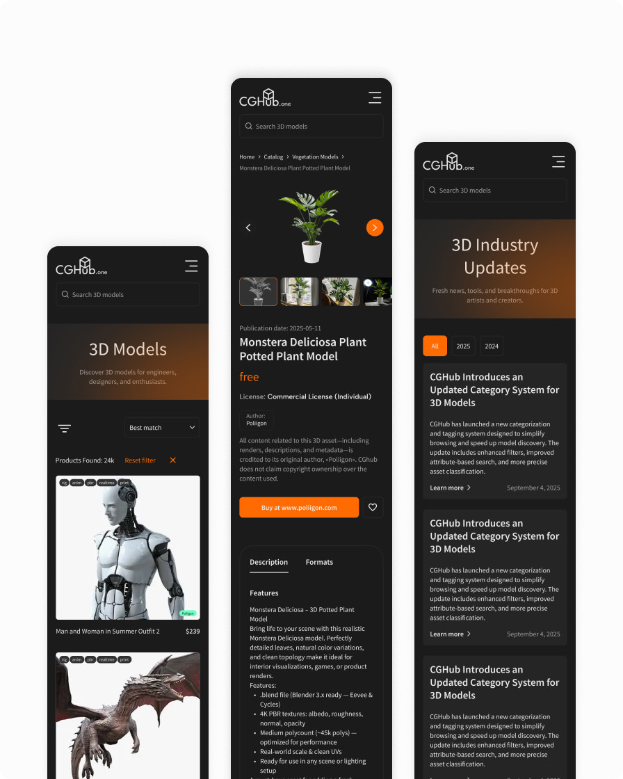 CGHub.one is an online platform we built from scratch, including the user‑facing catalog, the admin panel, and the automated parsing system. The service aggregates 3D models from leading global marketplaces into a single catalog and redirects users to the original asset pages for purchase or download. The interface is optimized for quick visual assessment of models and fast decision‑making, with cards, filters, and previews designed for day‑to‑day work of 3D teams. Contact ILAVISTA to build a similar custom solution for your business.