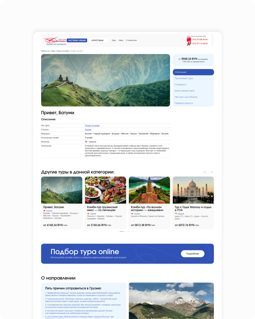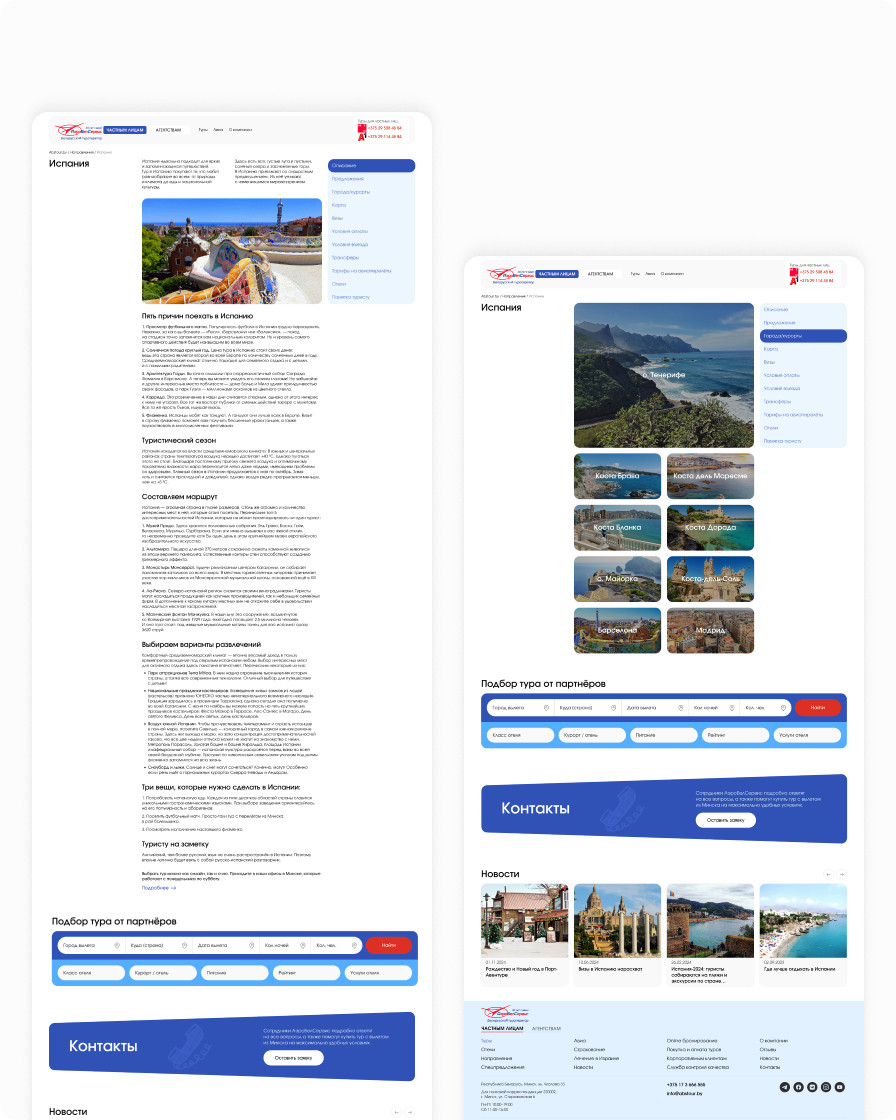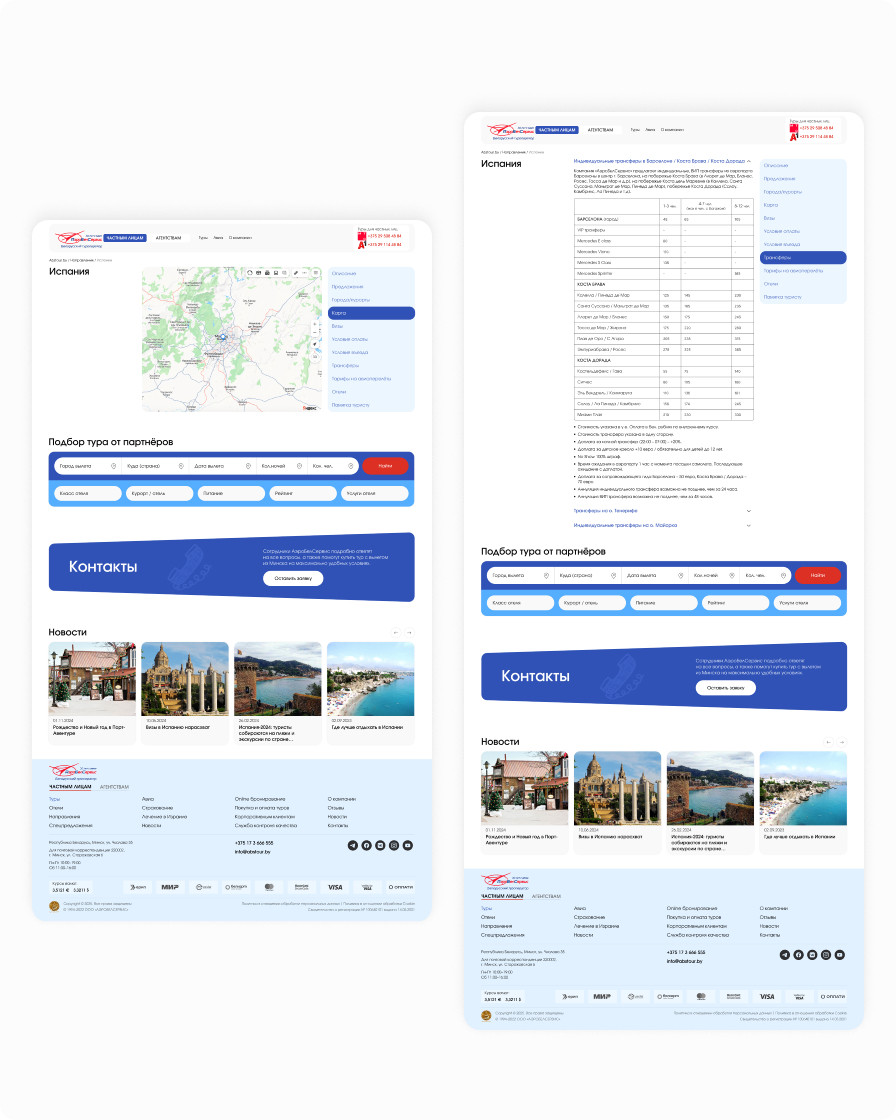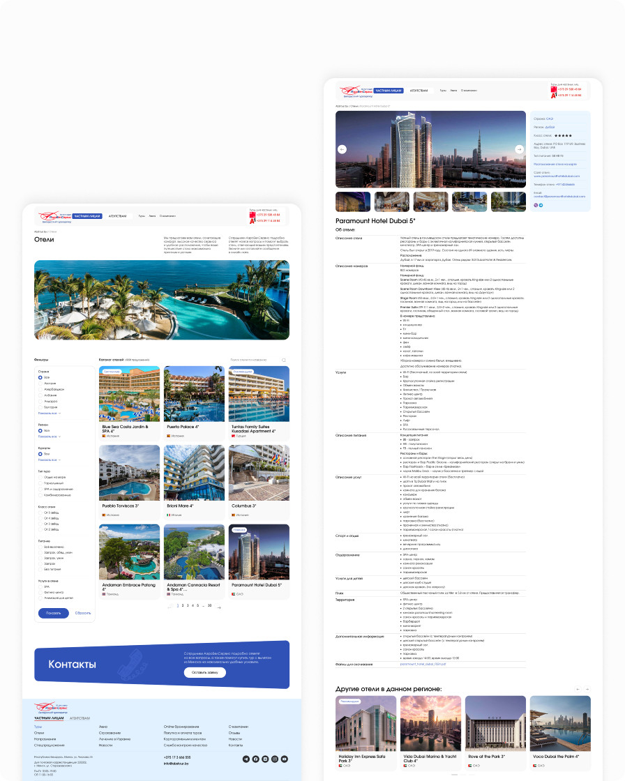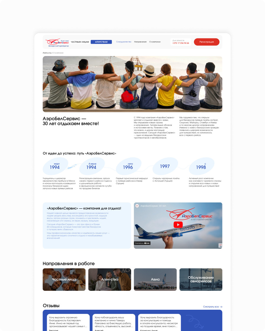 The AirBelService web platform enables users to search for and book tours, and provides detailed information about destinations, vacation programs, and the company’s services. The site is split into two roles: private clients, who select and book tours online, and agencies, who study all the necessary information and, after registration, gain access to additional pages. Content is managed via an administration panel, which allows the site to be updated quickly without developer involvement. Contact ILAVISTA to build a similar custom solution for your business.