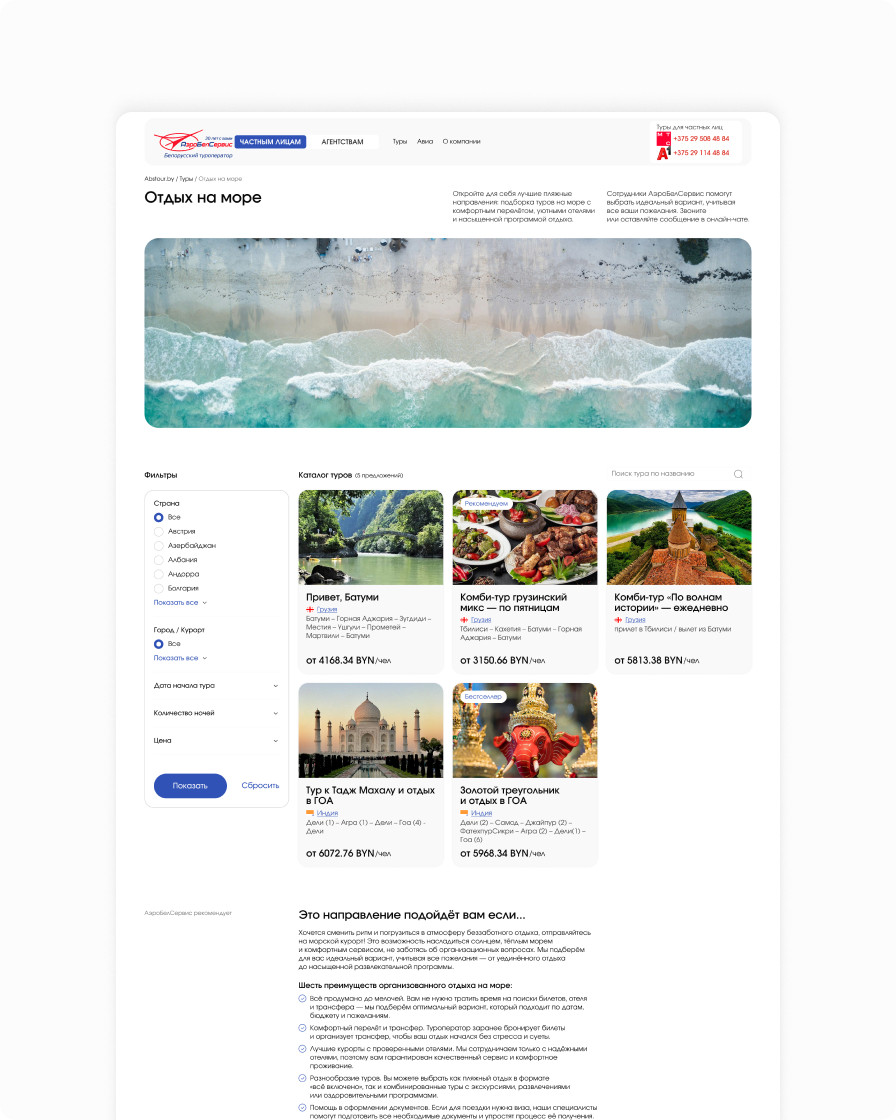 A web platform for the AeroBelService tour operator that supports tour search and online booking. The website is structured for two main roles: individual customers and partner agencies.
